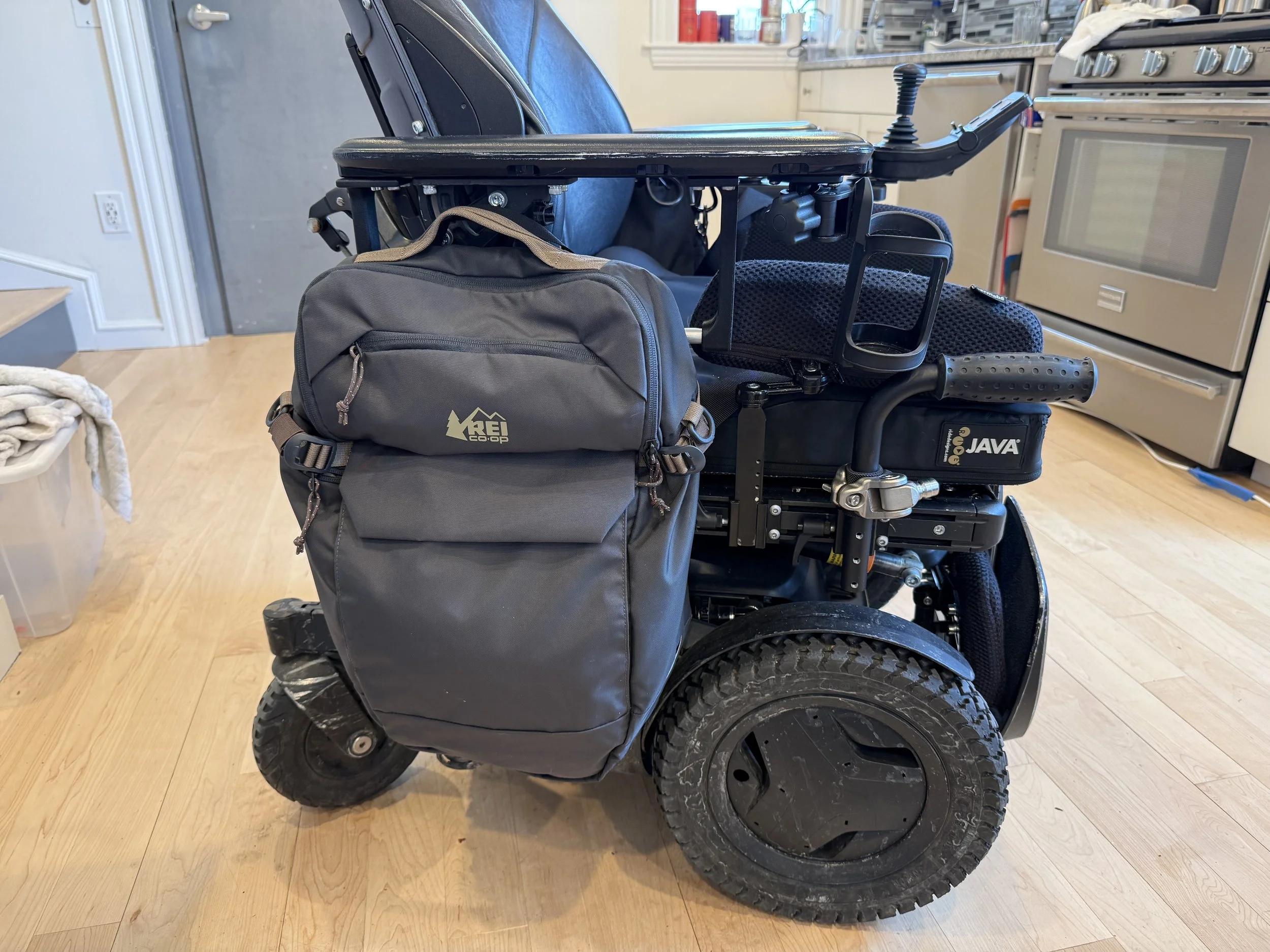 I chose the REI Junction Pannier because it has an easy to use rack clip system, fits my computer, and has a top access zipper which allows me to access the bag while it is attached to my chair. I found an older version on Facebook Marketplace for a bit cheaper. However, it is not water proof and needs a separate backpack cover to keep every thing dry.