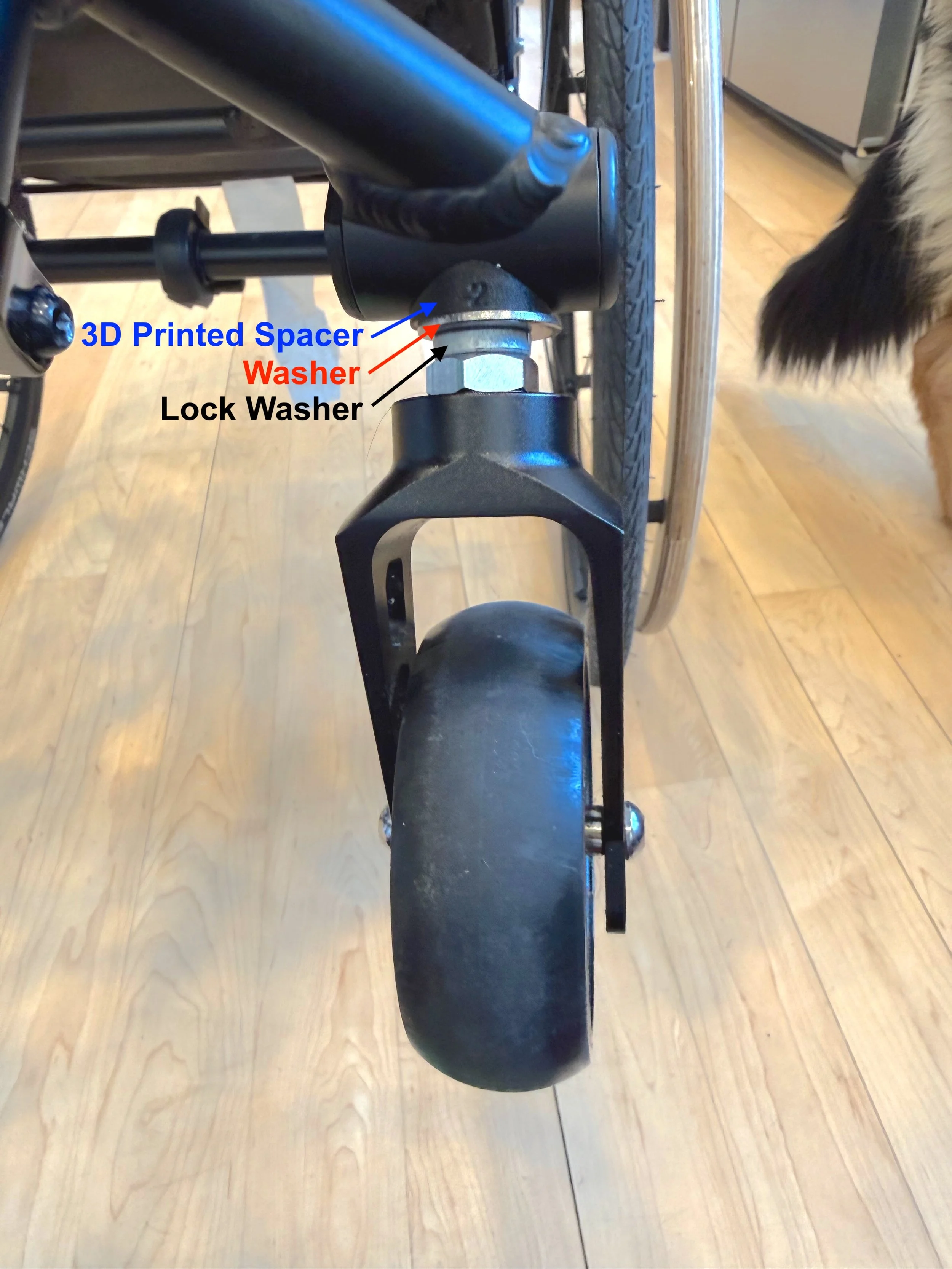 Picture of the 3D printed spacer installed on a Not A Wheelchair Paradox caster fork stem.