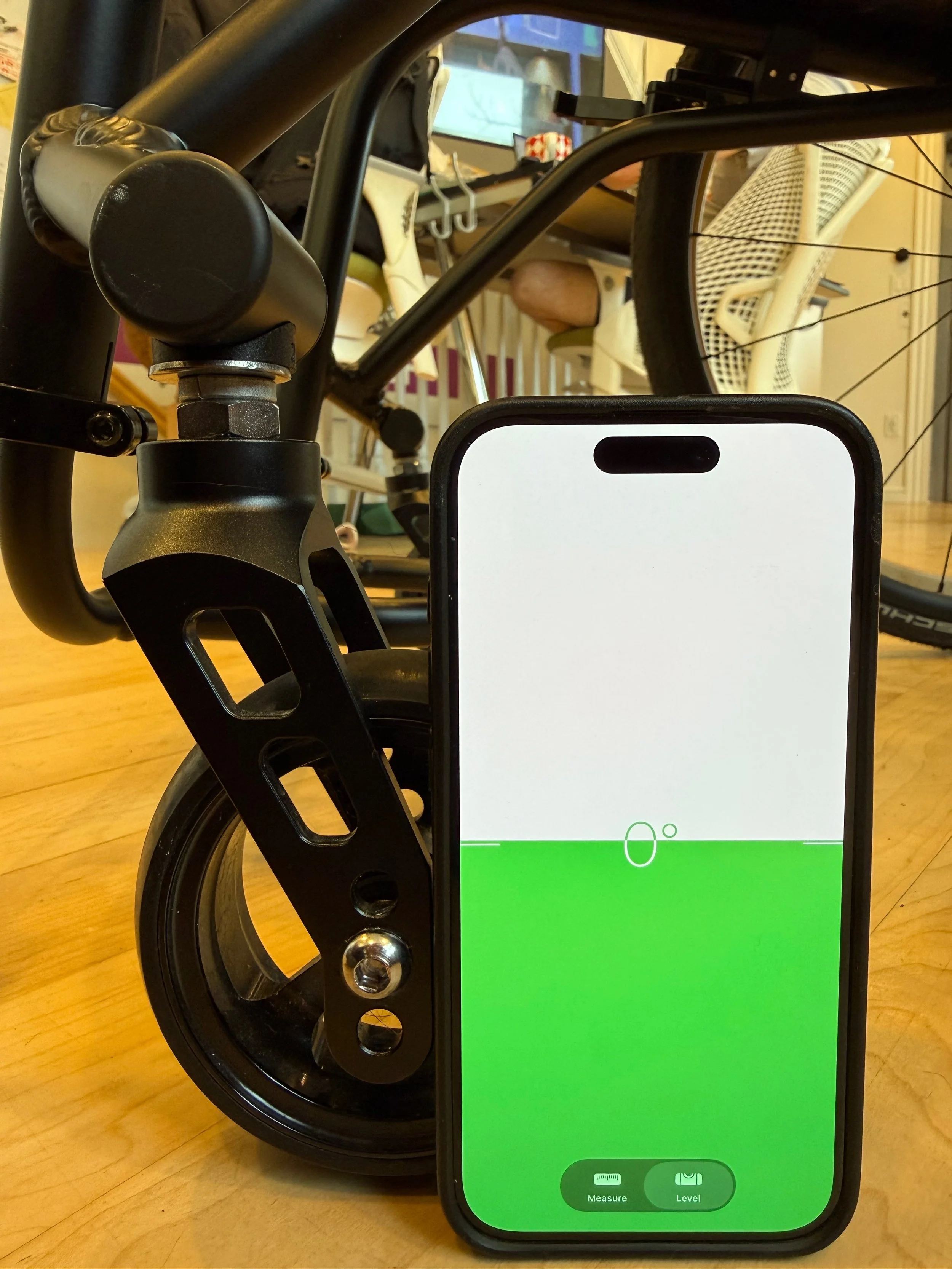 Flip the wheelchair back and use your phone to measure the angle of the caster fork in the correct position. [AngleCorrect]